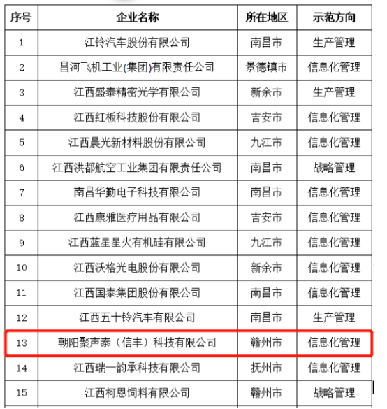 近日,江西省工業(yè)和信息化廳在其官網(wǎng)發(fā)布了《關(guān)于公布2021年度江西省管理創(chuàng)新示范企業(yè)認(rèn)定名單的通知》(贛工信企指字〔2022〕42號)。朝陽聚聲泰(信豐)科技有限公司入選2021年度江西管理創(chuàng)新示范企業(yè)名單。