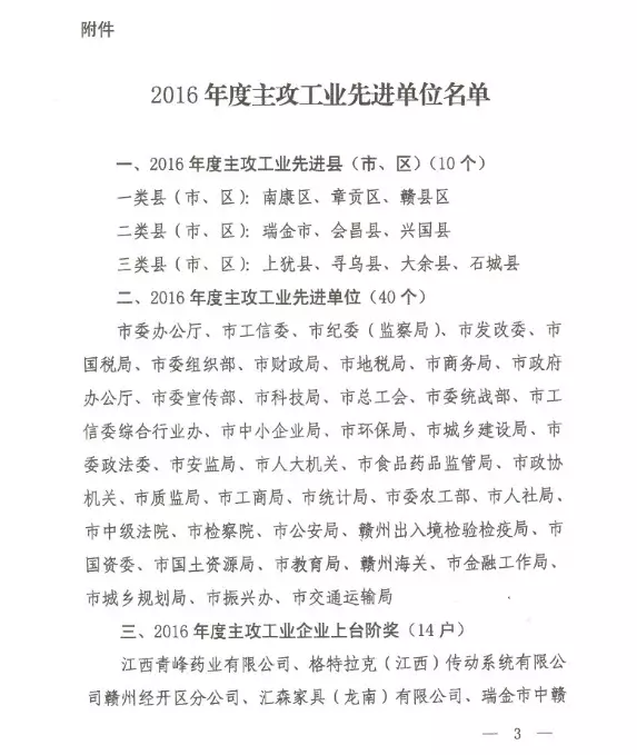 近日,贛州市委、市政府印發(fā)贛市字〔2017〕8號文件,通報表彰全市2016年度主攻工業(yè)先進單位,167個縣(市、區(qū))、市直(駐市)部門和企業(yè)獲得表彰。其中,南康區(qū)、瑞金市、上猶縣等10個縣(市、區(qū))榮獲“2016年度主攻工業(yè)先進縣(市、區(qū))”稱號;市委辦公廳、市工信委等40個單位榮獲“2016年度主攻工業(yè)先進單位”稱號;江西青峰藥業(yè)有限公司等14戶企業(yè)榮獲“2016年度主攻工業(yè)企業(yè)上臺階獎”;贛州市深聯(lián)電路有限公司等103戶企業(yè)榮獲“2016年度主攻工業(yè)成長型企業(yè)獎”。