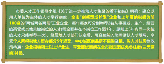 市委人才工作領(lǐng)導(dǎo)小組和市工信局聯(lián)合發(fā)文,明確了2020年度具備自主舉薦人才資格的企業(yè)名單,我公司為2020年度“兩型企業(yè)”創(chuàng)新型成長型企業(yè),享受自主舉薦2名人才資格,經(jīng)屬地人才部門認(rèn)定,可直接納入繼續(xù)緊缺人才范湊。